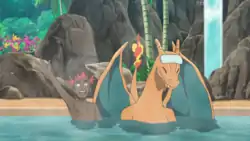 In I Choose Paradise!, Charizard joined the rest of the Ride Pokémon on a trip to the Pokémon Paradise Resort for a day of relaxation. During the day Charizard enjoyed a hot spring and massage alongside his Trainer. Later in the day Team Rocket stole some of the groups Pokémon, but failed to restrain the Ride Pokémon. Together they managed to rescue them and used a combined attack to send Team Rocket blasting off.