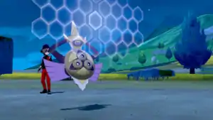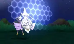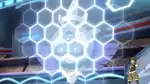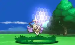 Aegislash swirls around while in Blade Forme and then turns into Shield Forme. Light blue hexagonal shapes then appear one by one in front of Aegislash until they form a shield, blocking itself from attacks. If the opponent makes direct contact with the shield, they glow blue, lowering their attack power; or, Aegislash switches from Blade Forme to Shield Forme. When the opponent tries to attack Aegislash, light purple hexagons appear in front of it, protecting it from attacks. | ||