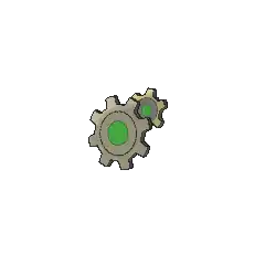 Klang is a Pokémon resembling three interlocking gears, with six teeth on the smaller two gears and eight teeth on the larger gear. The teeth of the smaller gears are a light gray, while their central regions are much darker. The teeth of the larger gear are a medium gray and its central region is darker. The left eye of the smaller gear is a white "X", while its right eye has a black pupil and a white sclera. It has a round green nose and a small mouth that is wide open. The large gear appears to have a face with a black square for its right eye, a black circle for its left eye, and a sharply angled white frown.