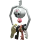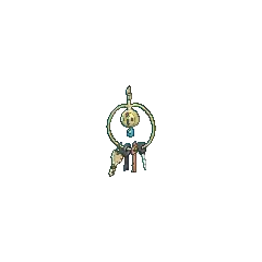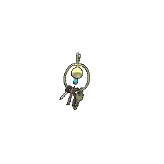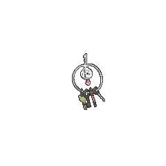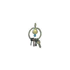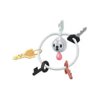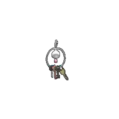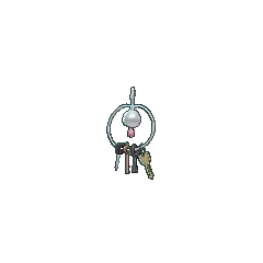 Klefki is a small, grayish-white Pokémon that resembles a key ring with four keys. It has a spherical head with a small, pink oval on its forehead. Two black circles and a keyhole form its eyes and mouth, respectively. Below its head is its pink, teardrop-shaped body with a white, teardrop-shaped marking in the middle. Extending from the top of its head is a horn that resembles an old-fashioned key with two wide, blunt teeth. Extending from either side of the key is a thin loop that surrounds Klefki. Hanging from the loop are various keys that this Pokémon has collected. Klefki is very tiny, tying with Alolan Diglett and Meltan as the shortest Steel-type.