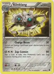 Charge Beam and Zap Cannon are both moves in the Pokémon games that Klinklang can learn. This card's Pokédex entry comes from Pokémon White.
