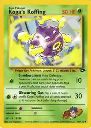 Koga's Koffing (Japanese: キョウのドガース Kyō's Dogars) is a Grass-type Basic Pokémon card. It is part of the Gym Challenge expansion.