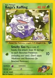 Koga's Koffing (Japanese: キョウのドガース Kyō's Dogars) is a Grass-type Basic Pokémon card. It is part of the Gym Challenge expansion.