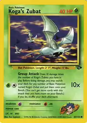 Koga's Zubat (Japanese: キョウのズバット Kyō's Zubat) is a Grass-type Basic Pokémon card. It is part of the Gym Challenge expansion.