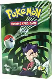 The Koga Theme Deck from the Gym Challenge expansion of the Pokémon Trading Card Game predominantly focuses on Koga and Grass-type Pokémon. Each Theme Deck is packaged with a 60-card deck, damage counters, a custom coin, a rulebook, and a card list.