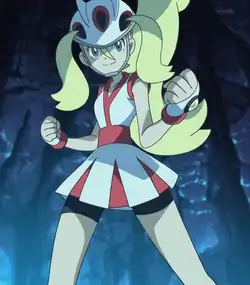 Korrina is a recurring character in Pokémon the Series: XY who met Ash and his friends in Mega Revelations! on their way to her hometown. The group accompanied her as she traveled to Geosenge Town to understand and master the Mega Evolution of her trusted partner Lucario. She left the group at Pomace Mountain in The Bonds of Mega Evolution!, and eventually battled Ash in a Gym battle in Showdown at the Shalour Gym!, where Ash emerged victorious. She made later appearances in Pokémon the Series: XY, and returned in Pokémon Journeys: The Series.