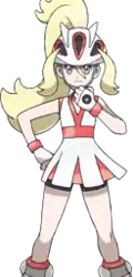 Korrina appears in Pokémon X and Y as a Gym Leader from Shalour City. Trainers who defeat Korrina will receive the Rumble Badge, along with TM98 (Power-Up Punch). According to the television show Gym Freaks and an NPC at Café Action!, she is a PR Video star. It also states that she dresses up in costumes; her magnificent legs able to shatter cave rocks into pieces using her axe-kick move.