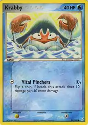 Krabby (Japanese: クラブ Crab) is a Water-type Basic Pokémon card. It is part of the EX Crystal Guardians expansion.