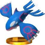 After being released from a Poké Ball, Kyogre opens its mouth and squirts out a stream of water. The water is non-damaging but causes characters to be knocked back with extreme force. Touching Kyogre's body will do damage. Kyogre also appears as a trophy.