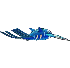 Primal Kyogre retains its general body structure but grows to more than double the size of its base form. Its main skin color becomes a darker shade of blue, the red markings along its body become light blue, and its eyes glow yellow with orange irises and orange-red pupils. The markings on its pectoral fins slightly change to form α symbols, which connect to its outer nails with red markings connecting the inner nails. Every part of its skin that was white in its base form becomes clear and translucent, with the large ovals on its head now connected to clear markings stretching from its tail to its forehead, where another α symbol is formed. The trailing parts of its tail grow longer and gain translucent webbing, and the areas between its pectoral fin markings also become clear. The translucent parts of its body reveal organ-like structures that glow with a mysterious light; it has a large "organ" at the center of its body, two smaller ones aligned with the large oval markings, and two more located in its pectoral fins. In the anime, Primal Kyogre is said to have widened the seas by a large margin simply by taking a swim.