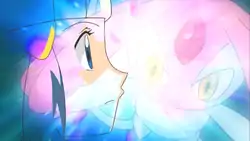 Dawn first encountered Mesprit at Lake Verity in Following a Maiden's Voyage!. After she had made friends with a stubborn Piplup, she crossed Lake Verity and saw the projected soul of Mesprit. It was seen in flashbacks in Dawn Of A New Era!, Pruning a Passel of Pals!, Uncrushing Defeat!, and Unlocking the Red Chain of Events!. It wouldn't be until The Needs of the Three! that Dawn would see Mesprit in its true form. Mesprit contacted Dawn in her dreams warning her of the destruction of the world.
