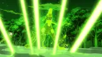 Zygarde 50% Forme glows and causes beams of green light to emerge from the ground, causing the ground to crack and break. | ||