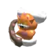 In its Incarnate Forme, Landorus is an orange, muscular humanoid Pokémon, which resembles a genie. It is a male-only species with no female counterpart. On its forehead are three, sharp, pink horns arranged in a slight, upwards arch. Landorus has white hair shaped like a short log on top of its head, a jagged white mustache, and two pointed orange ears on either side of its head. Its eyes are yellow with beady white irises and no visible pupils. The front of Landorus's body is covered in dark pink spots; most of them shaped like diamonds, pebbles, and raindrops. its broad chest consists of two joined, dark pink diamond-shaped pectorals, and its shoulders, elbows, and navel are adorned with designs resembling raindrops. It has two spotted muscular arms, with five fingers on each hand. Its lower body consists of a trailing cloud, with a long, curling, brown, branch or root-like tail. Landorus's tail has various flat protrusions running its span, each spotted in dark pink on its edge surface.