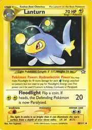 Lanturn (Japanese: ランターン Lantern) is a Lightning-type Stage 1 Pokémon card. It is part of the Neo Genesis expansion.
