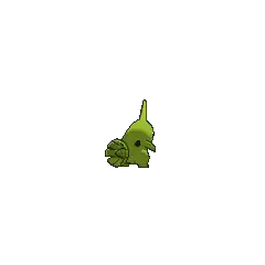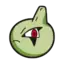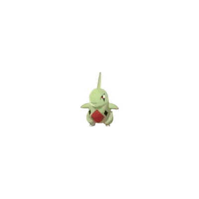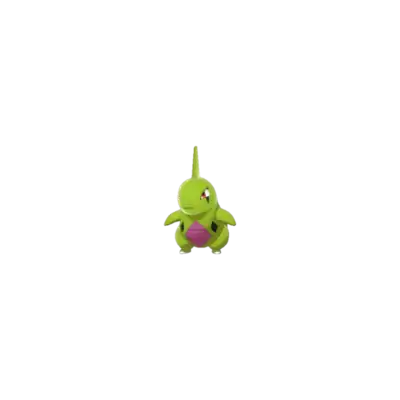 Larvitar is a small, green reptilian Pokémon with rocky skin. It has a blunt spike on top of its head, a short, rounded snout, and triangular, black markings below and on the upper corners of its red eyes. Red scales cover its diamond-shaped belly, and there are several small holes in its body. Its short arms lack fingers, while its feet have a single toenail each. It has a tail with a conical center surrounded by a ring of plate-like scales, causing it to resemble a tunnel-boring machine. Larvitar is born deep underground, far from its parent. It grows by consuming soil and will enter its pupal stage upon eating an entire mountain's worth of earth. Larvitar usually lives in mountains, hills, and caves.