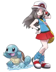 This character had no official name for fifteen years after her debut. She was unofficially referred to by fans as "Leaf" during this time, a name taken from unused Trainer data and one of her optional names in Pokémon FireRed and LeafGreen. She also went by this name in the E3 2004 trailer of Pokémon FireRed Version and Pokémon LeafGreen Version.[7] It was then used in Pokémon Masters EX and on merchandise such as Kotobukiya's ARTFX J figurine[8][9] and the Bandai's Pokémon Scale World collection.[10]