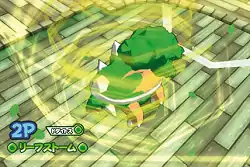 | Turtwig raises its head and calls out, making multiple leaves gather around it and start to glow green. The leaves then spiral around Turtwig in a tornado-like fashion. It then points its head at the opponent, sending the cyclone of leaves at the opponent. | |||