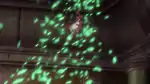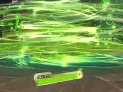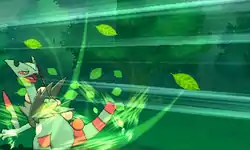 The seeds on Sceptile's back glow yellow and it releases a barrage of light green glowing leaves from all around at the opponent; or, a barrage of green leaves surrounded in a green aura appear around Sceptile's tail. The leaves then stretch out and surrounds the opponent, leaving the opponent encircled in a tornado of leaves, before the encircled opponent gets slammed into the ground. | ||