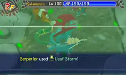 | The leaves on the tree on Torterra's back start to glow light green, and it releases a cyclone of wind and glowing light green leaves from the tree towards the opponent. | |||