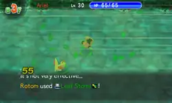 Mow Rotom forms a glowing green sphere in front of its mouth, then fires countless glowing green leaves from out of the sphere at the opponent. | ||