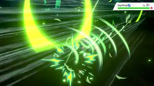 | Leavanny raises its arms and its body becomes outlined in turquoise energy. It is then surrounded by a large number of glowing green leaves, which it fires at the opponent after bringing its arms forward. Sometimes, Leavanny does not glow with energy. | |||