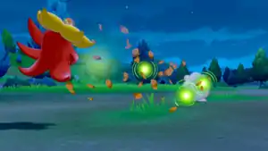Fomantis jumps in the air, spins around and releases multiple glowing green leaves from its body. The leaves then start spiraling in a tornado-like fashion while heading towards the opponent. | ||