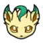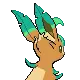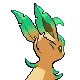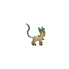 Leafeon is a mammalian, quadrupedal Pokémon. Its body is tan with dark brown paws. It has a multitude of small green sprouts growing all over its legs, chest, and back, with the longest one on its head, in front of four tan tufts of fur. Leafeon's ears and tail are stylized to resemble tattered leaves. It has brown eyes and a small, brown nose.