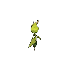Leavanny is a thin, yellow, bipedal insectoid Pokémon. It has a broad, split leaf around its large, round head and it has long antennae that end in semicircles. Its eyes are red with no apparent sclerae. Its tiny thorax is dark green, and its long abdomen is yellow and covered in a green leaf. Its hands are long and leaf-like with a "bite" taken out of each. Its upper arms are also leaf-like, but with a vein of yellow at the top. Its thin legs are yellow with dark green, thick segments around its upper legs, making them appear armored.