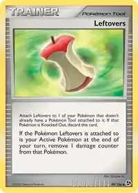 Leftovers was introduced as a Pokémon Tool Trainer card in the Pokémon Trading Card Game during the English Diamond & Pearl Series (the Japanese DP Era) in the Great Encounters expansion.