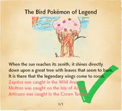 The Legendary Clue 3 tells the player more about the Legendary birds and their Galarian variants. It is required to be read in order to find each Legendary bird and complete "A Legendary Tree of a Legendary Three!" expedition set by Peony. The contents of Legendary Clue 3 change as the player progresses through the story.