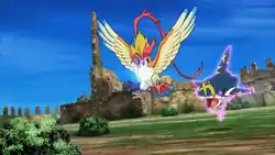 | Pidgeot is able to Mega Evolve into Mega Pidgeot. It tried to attack Ash's Talonflame and Pikachu and was later seen being attacked by Ash's Greninja's Water Shuriken in its Ash-Greninja form. It was later freed from Levi and Cherie's control when Alva's Mega Wave Crystal was destroyed and escaped.