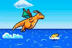 Dragonite is flying across the skyline of a big city and then over a big field with windmills. It notices a Pikachu drowning in the water, so it flies down, grabs Pikachu, and brings it to safety on dry land. Pikachu thanks Dragonite and it flies away.