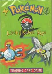 The Lightning Bug Theme Deck from Base Set 2 of the Pokémon Trading Card Game predominantly focuses on Lightning-type and Grass-type Pokémon. Each Theme Deck is packaged with a 60-card deck, damage counters, a custom coin, a rulebook, and a card list.