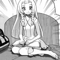 Lillie appeared in The Eclipse. She traveled to Altar of the Moone with Selene, hoping to find a way to help Nebby while recalling the events of her journey, such as seeing Nebby being attacked at Mahalo Trail and contronting Lusamine at Aether Paradise. When she played the Sun Flute alongside Selene's Moon Flute, the altar reacted to the music and caused Nebby to evolve into Lunala. Lillie pleaded Nebby to take her to her mother, but before it could do so, Lusamine and Guzma suddenly fell out of an Ultra Wormhole that had appeared above the altar, followed by Necrozma. Nebby battled against Necrozma, but wound up being absorbed by it. Seeing Nebby being taken almost caused Lillie to collapse, but Selene came to her side, encouraging to stand up as she prepared to battle Dawn Wings Necrozma.