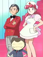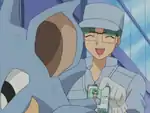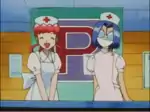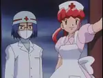 Fire and Ice | Jessie was disguised in a Nurse Joy costume complete with a mask and James disguised himself as an ordinary nurse, with a surgical mask covering his mouth and glasses, at a fake Pokémon Center that they set up. Surprisingly Jessie's Nurse Joy disguise was an imitation of the real Nurse Joy's appearance where the lips did not move, which Brock took notice of. |