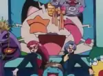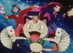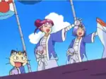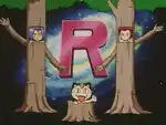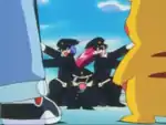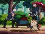 Two Hits and a Miss | Team Rocket arrived on the scene in ninja outfits. While Jessie and James wore navy-blue, Meowth and Wobbuffet were dressed in red. |
