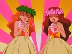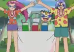 Abra and the Psychic Showdown | Jessie and James wore hula girls outfits complete with lei necklaces, green grass skirts and wigs. They greeted Ash and his friends as they entered Saffron City, and whisked them away to a building to collect their prize for being the millionth visitor to the city. |
