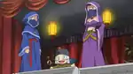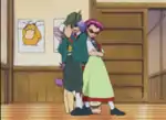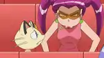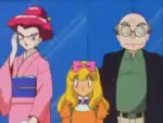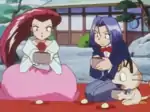 Pokémon Scent-Sation | Jessie and James disguised themselves as "Ashley's" parents, with Jessie wearing a pink kimono robe and glasses and her hair tied up in a bun on top, and James wearing a bald cap, a fake nose and glasses with Meowth hidden under his shirt to simulate a belly |