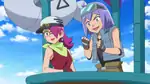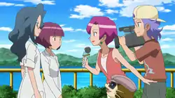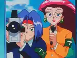 All Eyes on the Future! | Team Rocket disguised themselves as news reporters to interview Cosette and Sophie about the Anistar City Sundial. Jessie and James's costumes bear a striking resemblance to Gabby and Ty, respectively. |