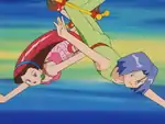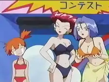Beauty and the Beach | Jessie and James both donned swimsuits to enter the Beach Beauty and Pokémon Costume Contest, and James wore an inflatable bodysuit giving him large breasts to give him a more feminine appearance. James's disguise is notable for causing the initial ban of this episode in the United States. |