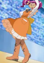 She used this outfit again in The Grass Route, along with James in a similar man version of the outfit, to compete in the Grass Tournament. Their costumes were colored green. Jessie appeared in a similar outfit in Outrageous Fortunes, this time as a fortune teller, when she conned Delaney into handing over his prized Poliwrath. Jessie would wear this outfit again in A Togepi Mirage!, though it was colored purple this time. |
