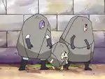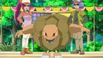 The Journalist from Another Region! | Meowth dressed as a Golem to participate in the Pokémon Sumo Tournament. Jessie and James also dressed casually to pretend to be Golem's Trainers. |