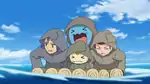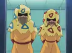 Capacia Island UFO! | The Team Rocket trio, along with Ash and Pikachu, put on Beheeyem masks to go unnoticed by Capacia Island's citizens that were possessed by an actual Beheeyem, and had the actual Pokémon face on their heads. |