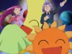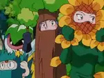 Grin to Win! | Meowth disguised himself as a Sunflora for the first time. He dressed up as a Sunflora for a total of six additional times in the Pokémon anime, specifically in The Grass Route, A Bite to Remember, Pacifidlog Jam, All Dressed Up With Somewhere To Go!, A Secret Sphere of Influence!, and Three Sides to Every Story!.