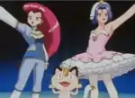 The Misty Mermaid | The trio wore Swan Lake-inspired costumes and performed in the Cerulean Gym's Underwater Ballet show. Jessie dressed as a prince, while James was in a pink tutu and Meowth had a swan float ring around his waist.