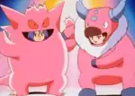 In The Pink | Jessie and James took inspiration from Pinkan Island's unusually pink colored Pokémon, and posed as a pink Tauros and Gengar, respectively.