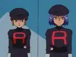 Electric Shock Showdown | Jessie, James, and Meowth appeared in black Ōendan outfits, complete with hats, black shades, and a flag emblazoned with an R. Jessie's outfit has a blue undershirt, James's is red, and Meowth's is green. Misty saw through their disguises and thanked them for their support, much to their surprise. This disguise reappears in The Problem with Paras and in Princess vs. Princess. |