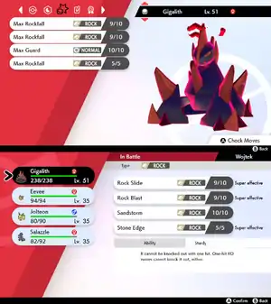 When a Pokémon is Dynamaxed, if the player looks at the party screen, the moves will be listed as if the Pokémon weren't Dynamaxed (Example: Rock Slide, Rock Blast, Sandstorm, Stone Edge). However, when checking the summary screen, the moves are displayed as Max Moves, in this case, Max Rockfall (three) and Max Guard.