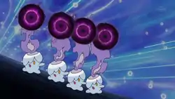 After the group confronted the Litwick and their leader Lampent, the Ghost-type Pokémon opened a vortex to the Ghost World. To trap everyone in the Ghost World they began using Shadow Ball and Inferno. However, everyone began to fight back with teamwork using Pikachu, Oshawott, Dwebble, Woobat, and Yamask to save themselves and send the Litwick and Lampent back to the Ghost World. After defeating the Pokémon, they rushed outside to see that the mansion was actually in ruins, with Litick's earlier trickery making it appear in a decent state. Team Rocket soon fled, and as it began to rain again, Ash and his friends sought shelter in a tree hollow instead.