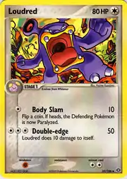 Body Slam is a move in the Pokémon games that Loudred can learn via Move Tutor in Pokémon FireRed, LeafGreen, and Emerald. Double-Edge, formatted on this card as Double-edge, is also a move in the Pokémon games that Loudred can learn via Move Tutor in Pokémon FireRed, LeafGreen, and Emerald.